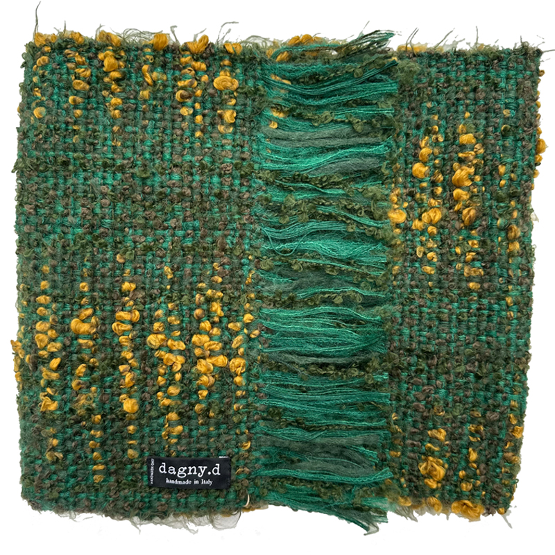 Each scarf is unique, but where I have a few which are very similar I have grouped them together under the same colour reference. This one in particular is so original with its rich green colour combined with boucle in mustard yellow.