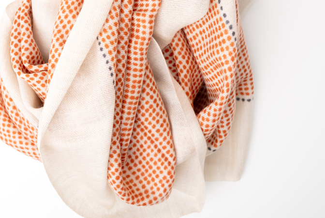 You will love this timeless classic wrap in a classy dots design. The perfect all year round accessory. Wear elegantly draped or simply knotted at the neck; this wrap looks fabulous in the summer and winter months. It comes with the orange dots main design with a line of grey dots all around.