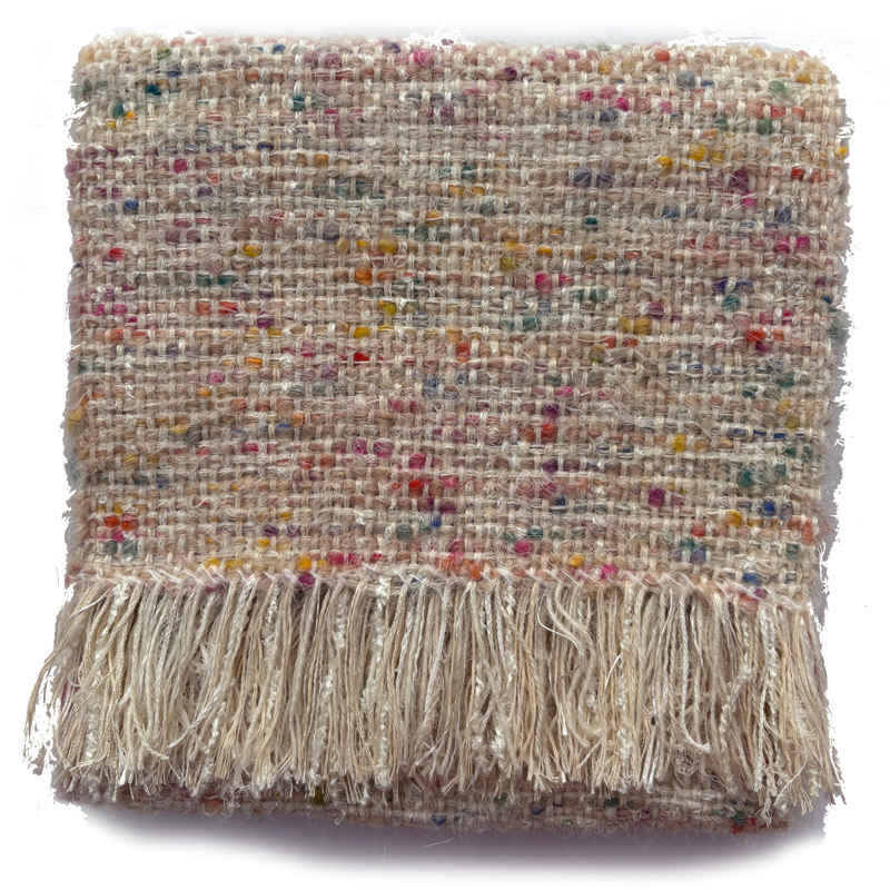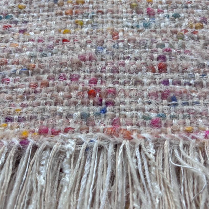 Each scarf is unique, but where I have a few which are very similar I have grouped them together under the same colour reference. This fun off white scarf hasa melange of different pastel colours.