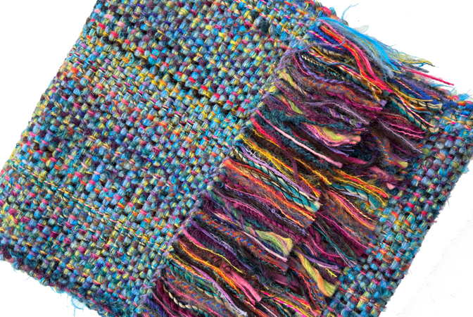 Each scarf is unique, but where I have a few which are very similar I have grouped them together under the same colour reference. This fun scarf has a base in light blue with a combination of many different colours.